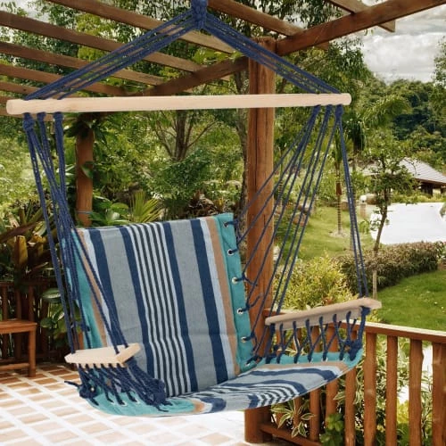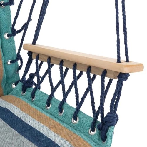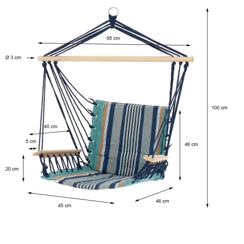 Le fauteuil avec ses accoudoirs confortables est fabriqué en coton solide et en bois de haute qualité et attire tous les regards sur la terrasse, dans la maison ou dans le jardin. Il est facile et rapide à fixer, de sorte qu’il peut être placé presque partout. Grâce à son petit volume, vous pouvez également le ranger rapidement et sans encombrement à tout moment.