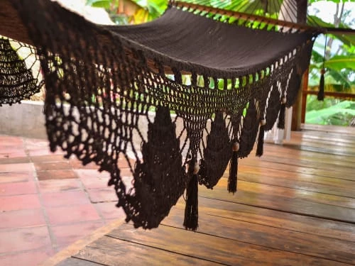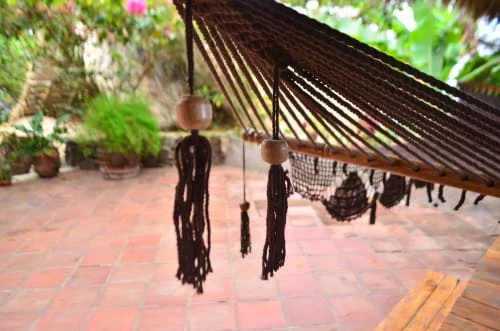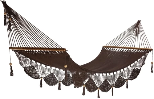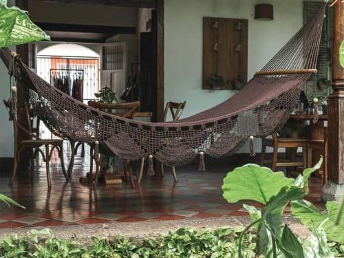 Les Hamacs à barre en bois permettent de garder le Hamac ouvert ce qui le rend trÚs décoratif. Sans aucun doute, le Hamac nicaraguayen est unique en son genre. Le coton torsadé offre une touche cocoon et luxe à la fois. Son élégance se caractérise par ses ornements suspendues (accessoires en bois) ainsi que ses franges latérales. Son corps tissé à la main par des artisans du Nicaragua, avec la technique du double point, offre le plus grand confort en position allongée en épousant parfaitement le corps.