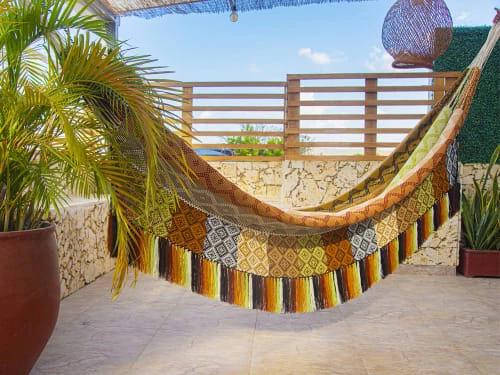 Cet immense Hamac “double face” de 1,80m de largeur est confectionné à la main en fil extra fin d’acrylique. Issu du commerce équitable, il est entièrement” sculpté” sur ses deux faces. Seuls les Indiens Wayuu et certains artisans de San Jacinto sont capable de réaliser ce type de Hamac car cela nécessite une technique de fabrication bien spécifique. Son design se caractérise par sa couleur multicolore et par sa belle sculpture qu’il porte tout au long du lit du hamac. Ses franges sont en tissu plat.