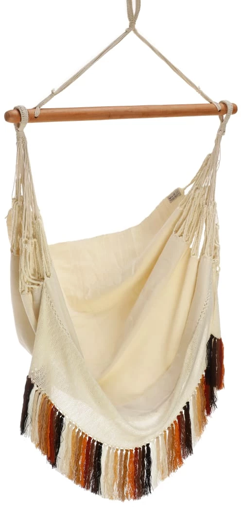 Ce Hamac chaise est fabriqué entièrement à la main par nos artisans Colombiens. 100% écologique, le processus de fabrication n’a pas bougé depuis des centaines d’années et c’est le même qu’utilisaient leurs ancêtres. Le coton est cultivé directement par les producteurs de la région.