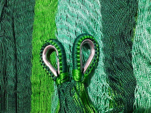 100% Nylon (La matière des filets de pêche) : La seule matière permettant de laisser votre Hamac en extérieur, été comme hiver, sans avoir à le rentrer! le Hamac Esperanza peut supporter les climats extrêmes et ne craint ni le gel, ni la pluie, ni le soleil. Cependant, pour plus de soin et de durabilité, il est recommandé de le conserver à l’abri après utilisation. Son fil épais et ses bras de 156 cordes sont les ingrédients d’un Hamac qui durera des années.
