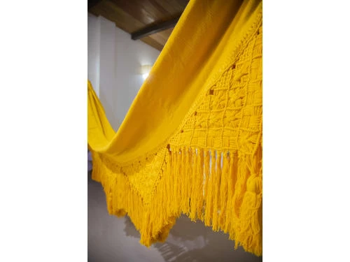 Ce Hamac est tissé, fil par fil, sur de simples métiers verticaux à quatre pôles, tandis que d’autres artisans s’attachent à fabriquer les têtes (cordes de coton) pour l’accrocher. Fabriqué en une seule pièce, il n’est pas coupé, il n’a ni finition ni couture, ce qui lui confère une valeur particulière.