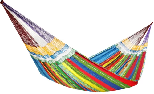 En raison de son excellente technique de tissage et à ses couleurs spectaculaires, ce Hamac très résistant, se distingue par son confort absolu. L’une des particularités du Hamac MAYA est son bras en filet tissé. Des attaches artisanales sont tissées sur les bras ce qui les rends plus visibles et résistants. Il faut dix à quinze jours pour fabriquer un Hamac comme celui-ci.