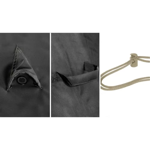 matière : 100% polyester enduit PVC (210g/m²). Cordon serrage permettant le maintien de la housse. Zip installé pour faciliter l’installation 2aérateurs pour éviter la condensation.Traitement anti UV Housse imperméable et déperlante.