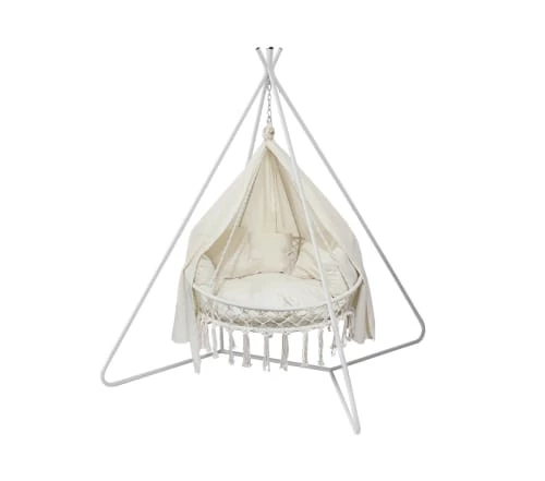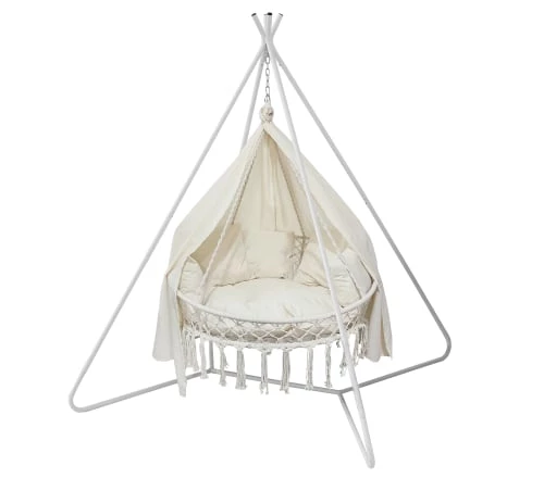 Avec une structure en acier galvanisé de coloris crème et une fauteuil avec habillage macramé en polycoton crème avec frange, vous craquerez pour son design épuré .